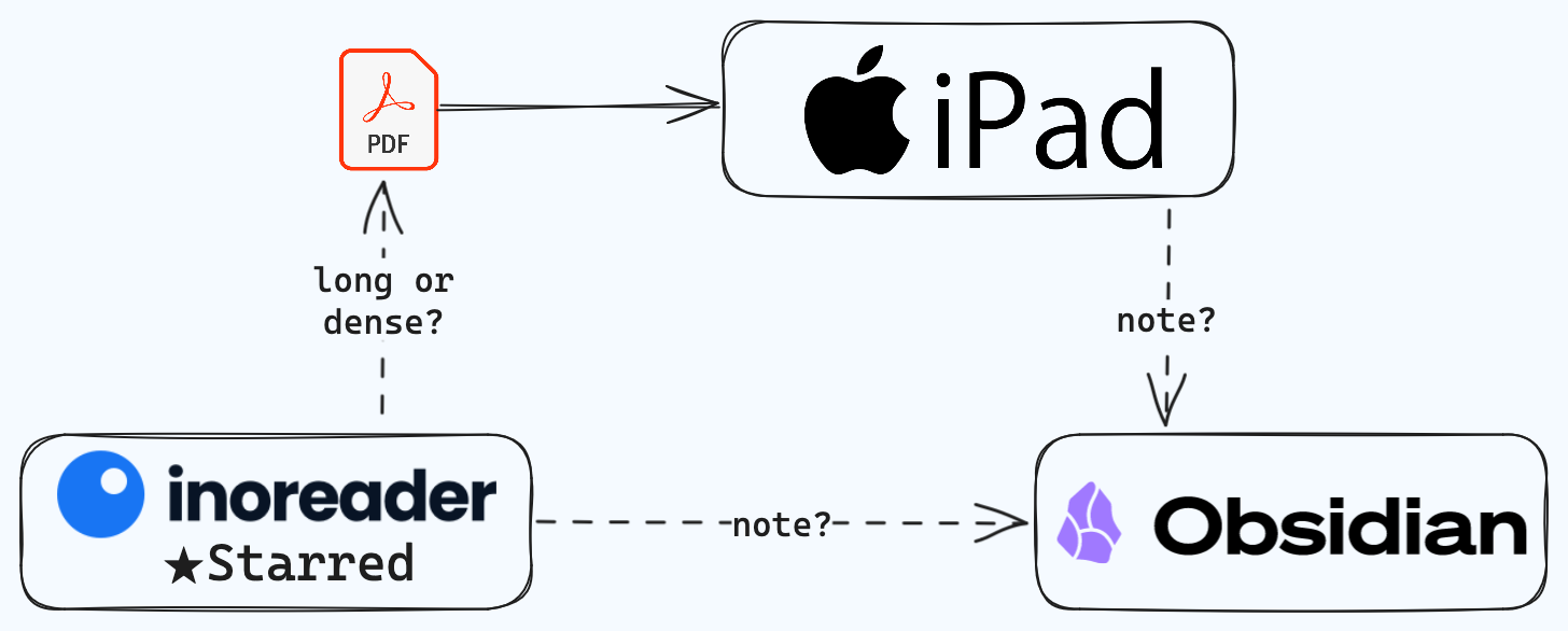 TLDR: Here is a simplified diagram of how I keep reading articles, books, and other materials without overwhelming myself or having a never-ending pile of to-read items. In this blog post, I will go into the details of each part of the workflow, the tools I currently use, the alternatives I have tried, why they work for me, and what I can improve in the process. Feel free to use the above table of contents to jump to the section that is more interesting to you.