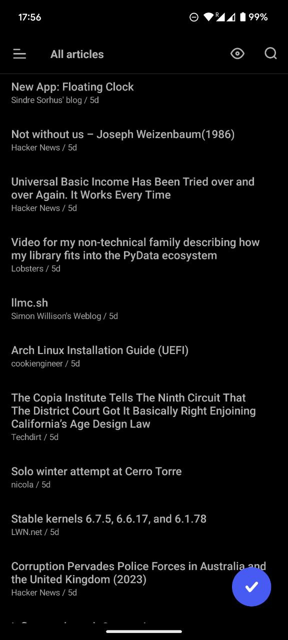 - Mark as read while scrolling (Very important for quickly shortlisting items from the feed. This is probably the main reason I’ve been able to replace Inoreader with social media apps.)